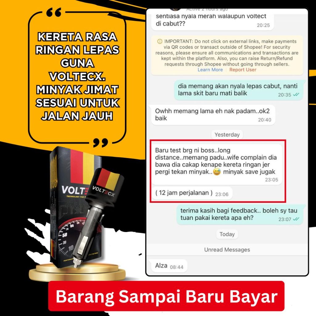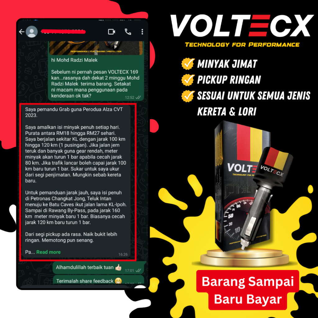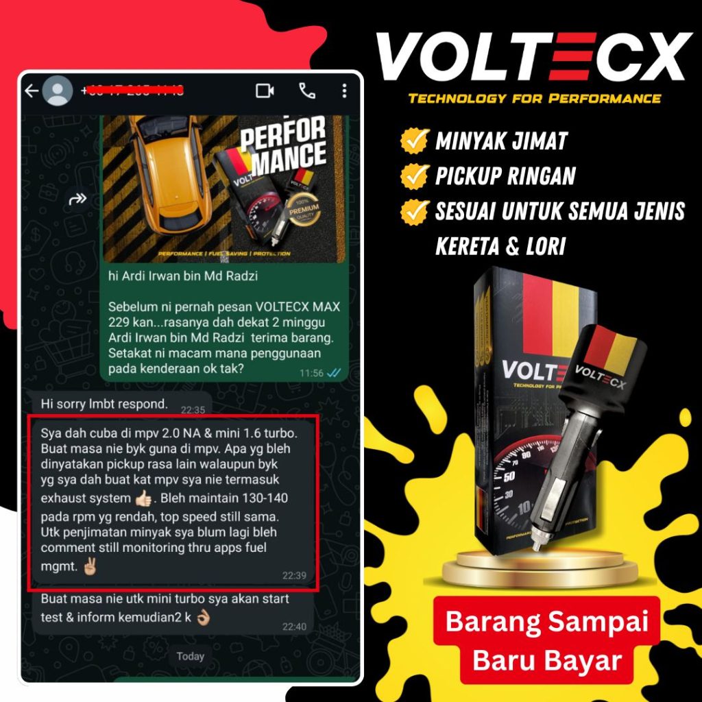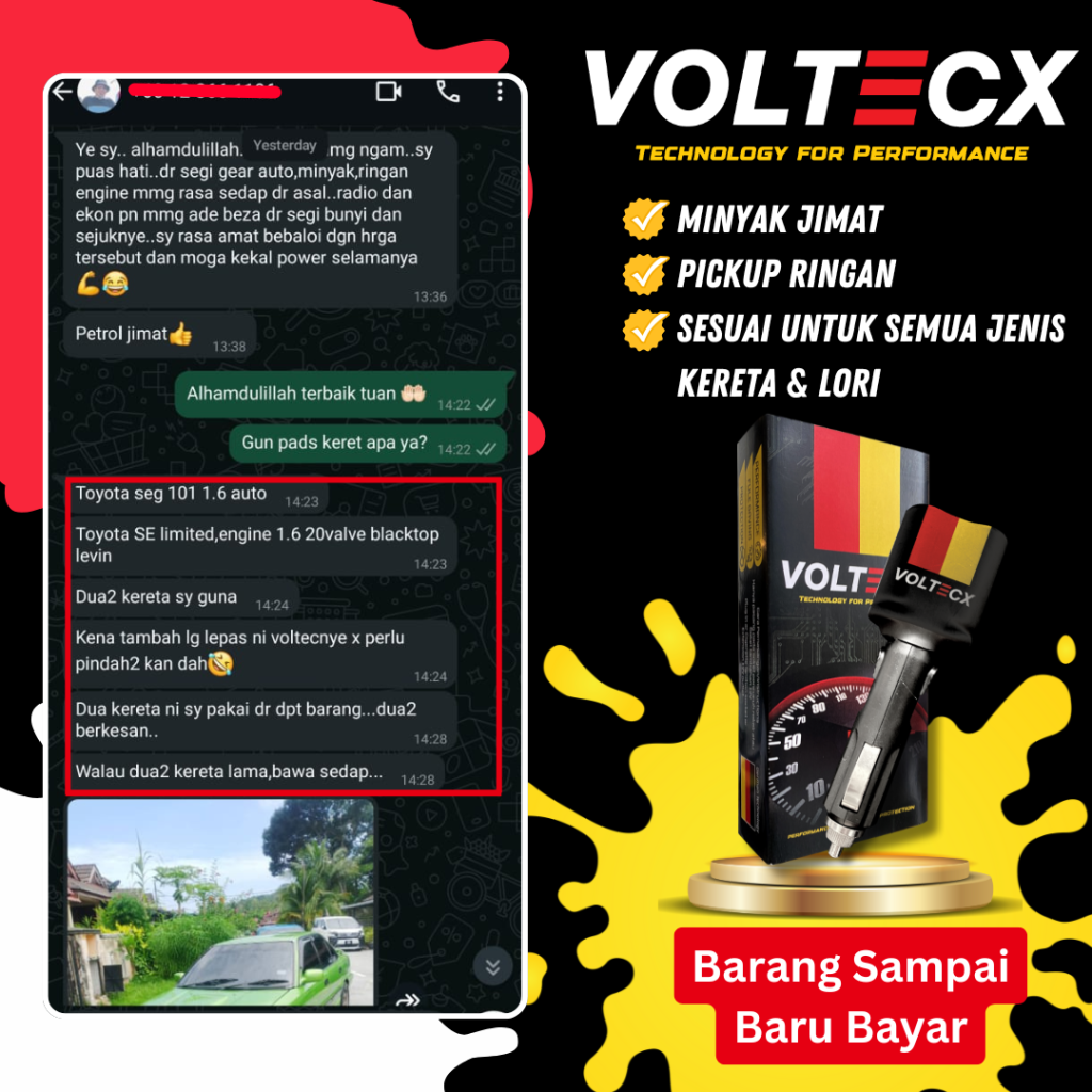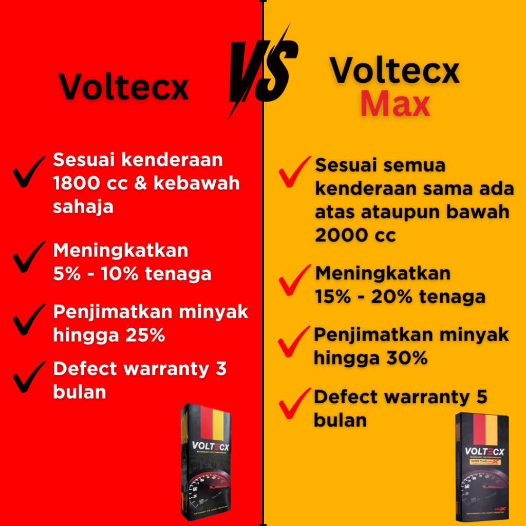 Voltecx adalah untuk kenderaan bawah 2.0 cc seperti kereta. Manakala Voltecx Max untuk kenderaan berat atau 2.0 cc keatas seperti lori/bas